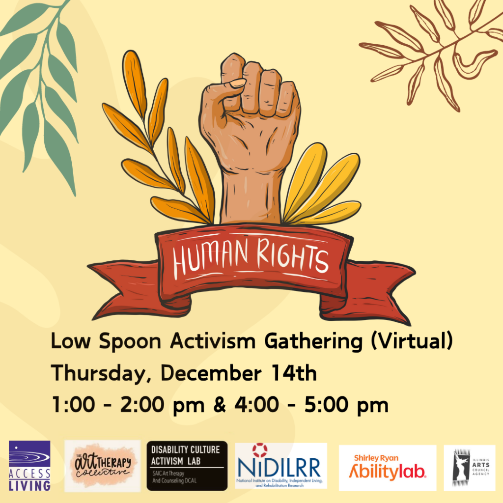 This series of event is brought to you by the Arts and Culture Project at Access Living, the Disability Culture Activism Lab (DCAL), Art Therapy Collective at School of the Art Institute of Chicago, and the Shirley Ryan Abilities Lab. The contents of this series of workshops were developed under a grant from the National Institute on Disability, Independent Living, and Rehabilitation Research (NIDILRR grant number 90RTCP0005). NIDILRR is a Center within the Administration for Community Living (ACL), Department of Health and Human Services (HHS). The contents of this series of workshops do not necessarily represent the policy of NIDILRR, ACL, or HHS. You should not assume endorsement by the Federal Government. This program is also partially supported by a grant from the Illinois Arts Council Agency.