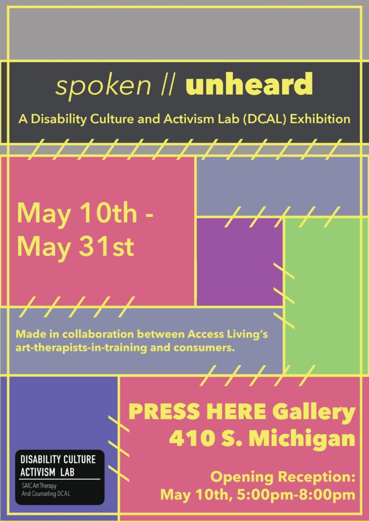 The Arts & Culture Project is excited to announce the opening reception of spoken//unheard: A Disability Culture Activism Lab (DCAL) Exhibition taking place at the Center for Mad Culture.