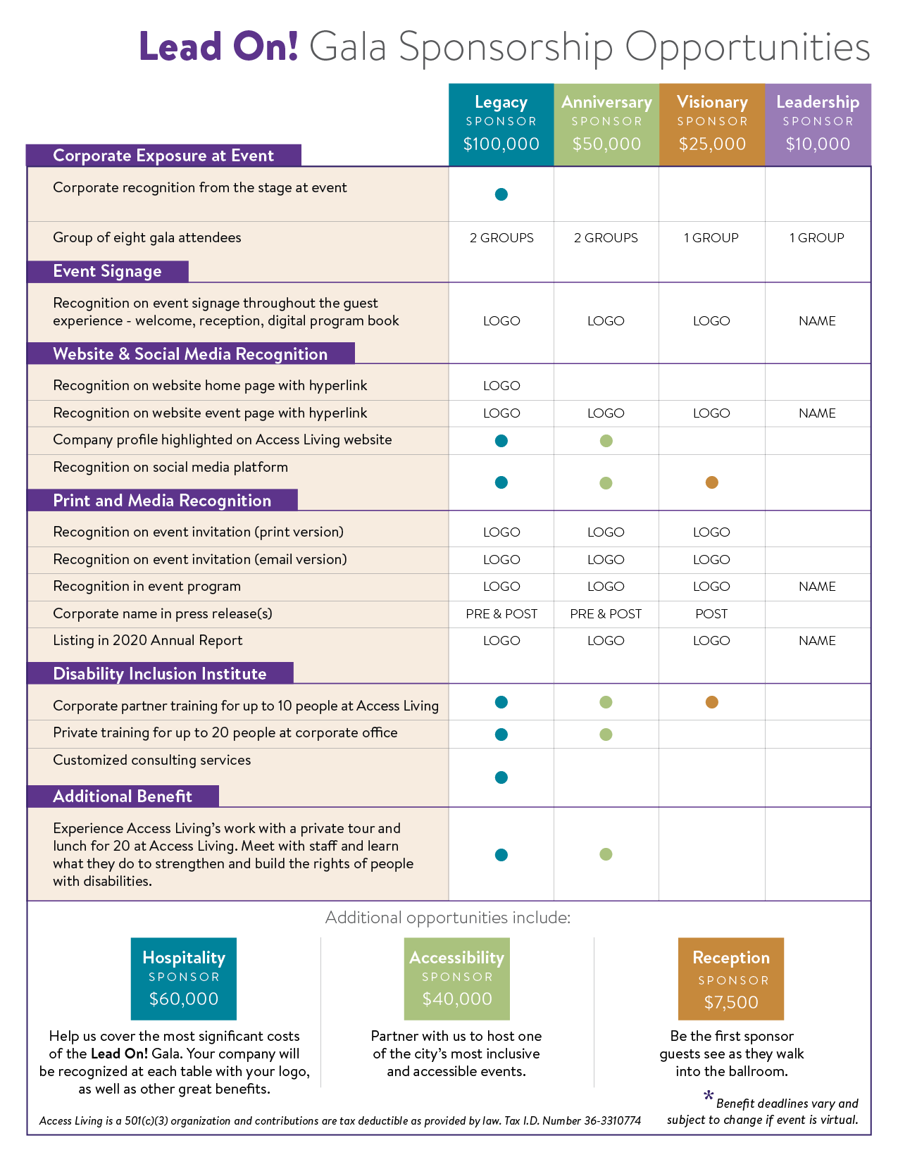 There are myriad sponsorship opportunities are available for Access Living’s 2020 Gala, which will celebrate 40 years of Access Living and the life and legacy of our founding CEO, Marca Bristo. (Click graphic to expand.)